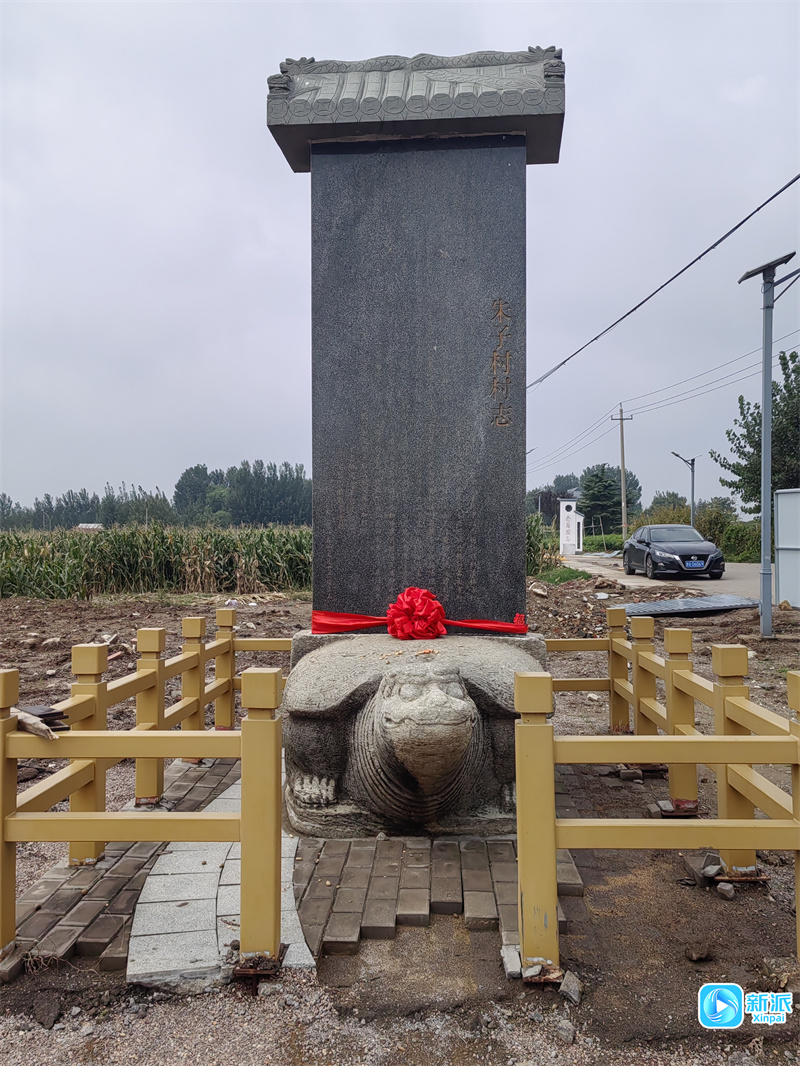 經(jīng)由一條東西大道穿過朱子村,在村東大路邊,石龜靜靜地安臥在那里。石龜面向東,龜背上有一塊新修的石碑。碑的正面是朱子村村志,背面是碑記,記述了當(dāng)?shù)卣痛逦w移石龜及立碑的有關(guān)情況。因年久風(fēng)化,石龜?shù)凝旙w有多處明顯裂紋。石龜四周立起了護(hù)欄,加以保護(hù)。透過斑駁的石體,足見石龜經(jīng)歷過的滄桑與風(fēng)雨。