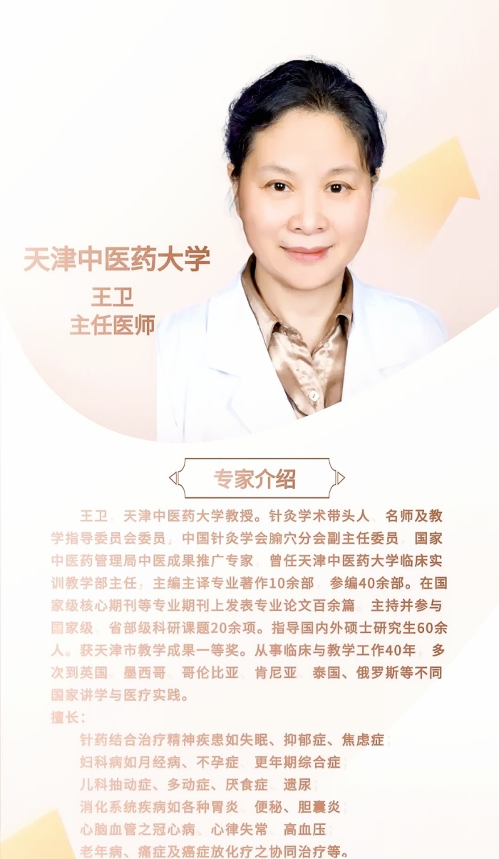 王衛(wèi),天津中醫(yī)藥大學(xué)教授。針灸學(xué)術(shù)帶頭人、名師及教學(xué)指導(dǎo)委員會委員,從事臨床與教學(xué)工作40年,多次到不同國家進(jìn)行講學(xué)與醫(yī)療實踐。擅長針?biāo)幗Y(jié)合治療精神疾患如失眠、抑郁癥、焦慮癥,婦科病如月經(jīng)不調(diào)、痛經(jīng)、不孕癥、更年期綜合癥,兒科抽動癥、消化不良厭食癥、小兒遺尿,消化系統(tǒng)疾病如胃痛、腹瀉、便秘、膽囊炎,心腦血管疾患胸痹、心悸、高血壓,以及老年病與痛癥等。