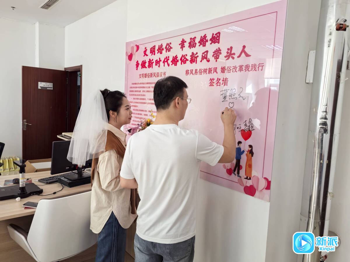 新人們紛紛在婚事新辦承諾墻上簽名并表示:“為愛情減負(fù),為幸福護(hù)航,樹婚育新風(fēng)!愛滿峽山,我承諾,我先行!”